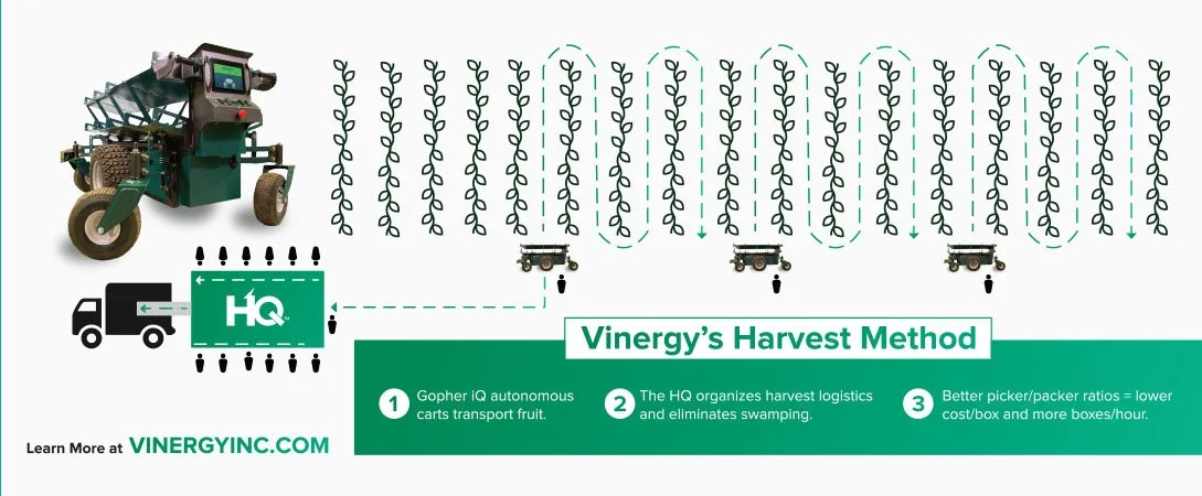 The Gopher iQ is an autonomous cart that transports fruit from pickers to the packing location. This combination allows for optimum efficiency in the table grape harvest.